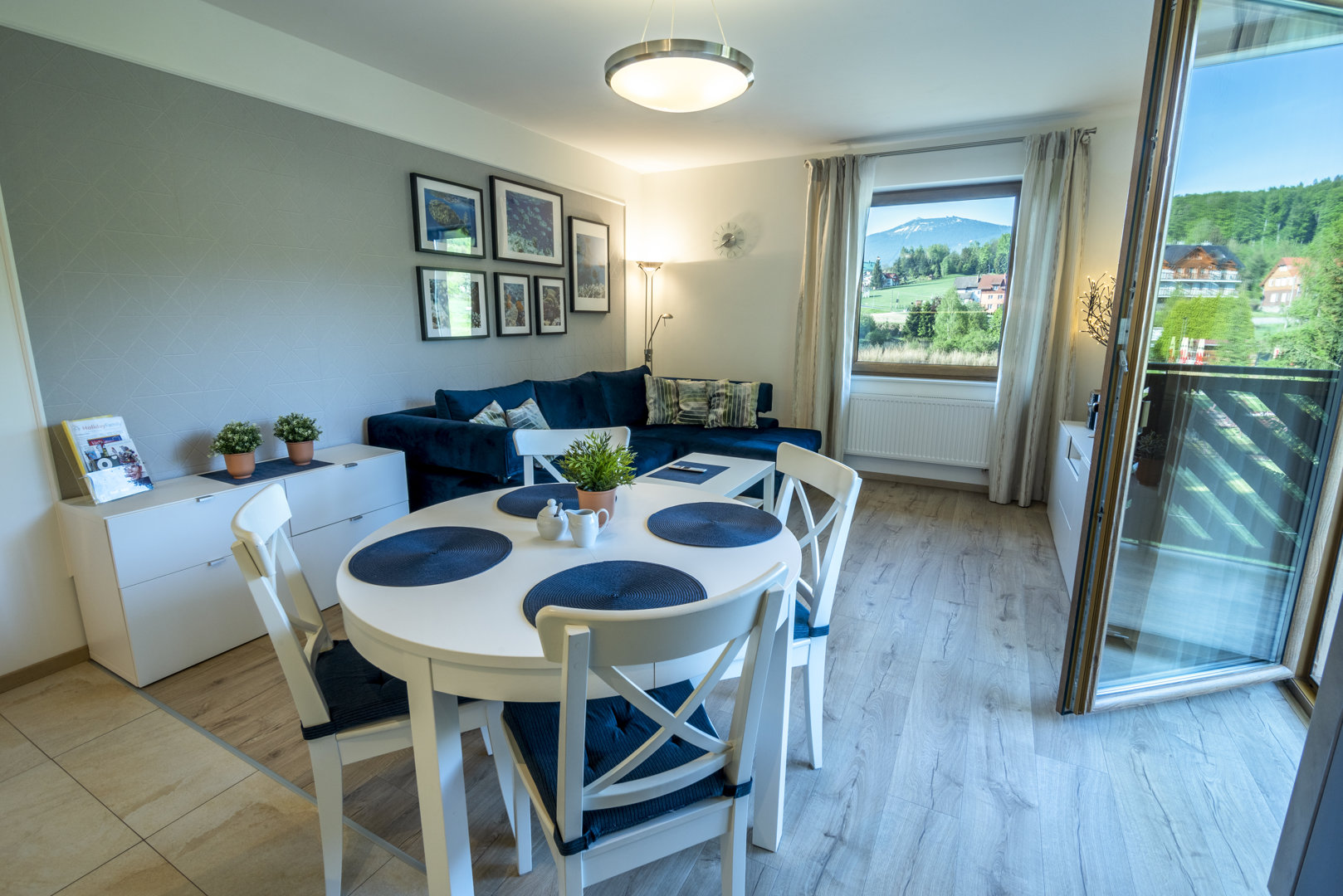 A unique apartment with a beautiful view of the panorama of the Karkonosze Mountains and Szrenica from the balcony or living room. Apartment for up to 4 people Amenities at a glance: underground parking balcony bedroom: double bed living room - larg