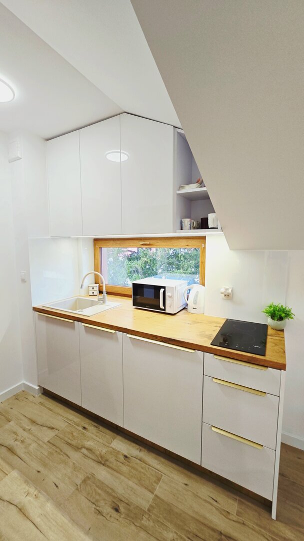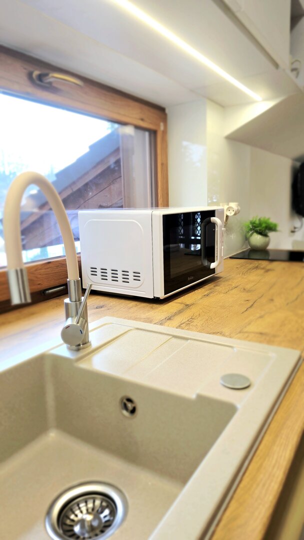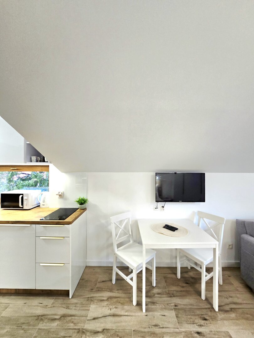 Aneks kuchenny: W pełni wyposażony w sprzęty AGD oraz sprzęt do przygotowania posiłków, kafeterka właska, ekspres przelewowy. Szafki i blat oferują dużo miejsca na przechowywanie i przygotowywanie posiłków.
