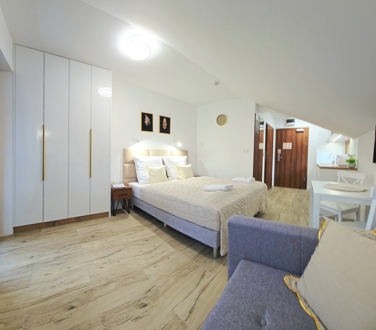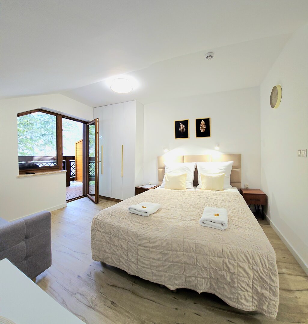 sypialnia z wygodnymi łóżkami pojedynczymi zestawionymi, szafkami nocnymi i przestronną szafą oraz rozkładana sofa, na której zmieści się 1 osoba dorosła lub 2 dzieci do 12 lat. Wystrój utrzymany w ciepłych, relaksujących kolorach.