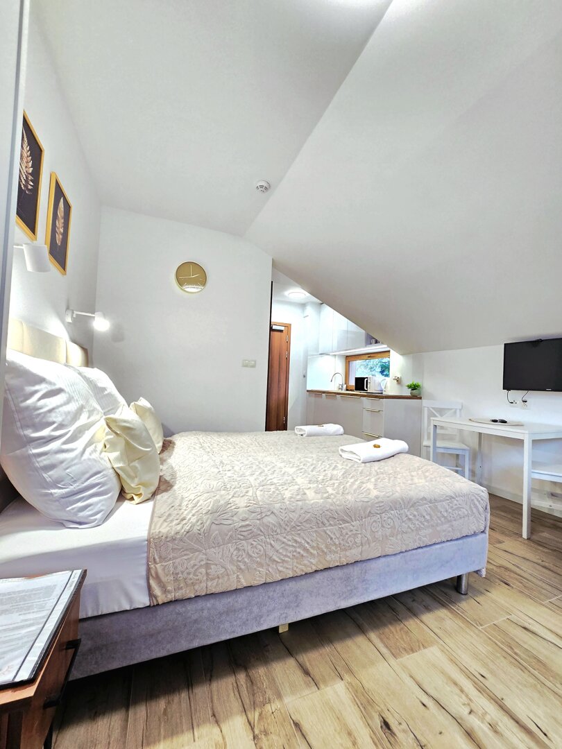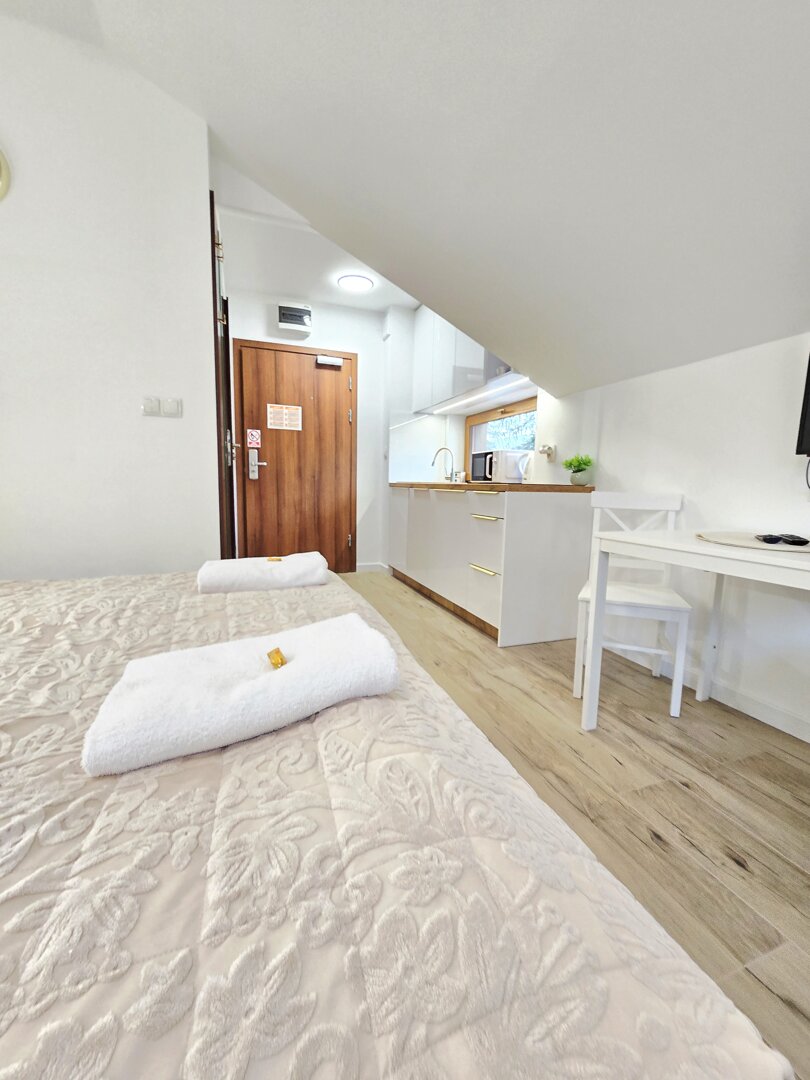 Wygodny apartament dla do 3 osób, w centrum miasta. Udogodnienia w skrócie: otwarty pokój z aneksem kuchennym, balkon, miejsce parkingowe, ekspres przelewowy, żelazko.