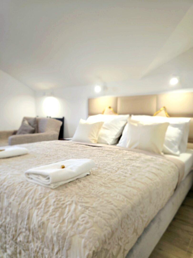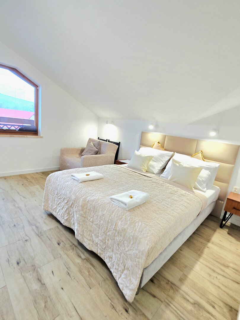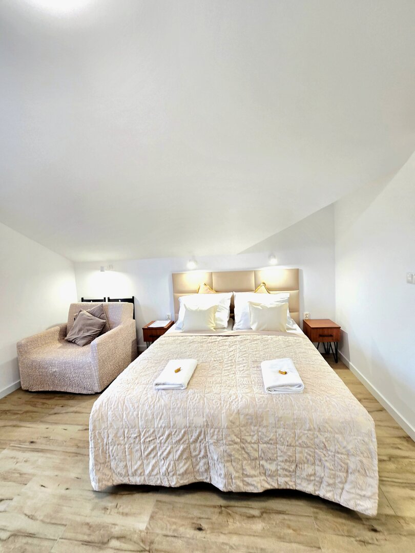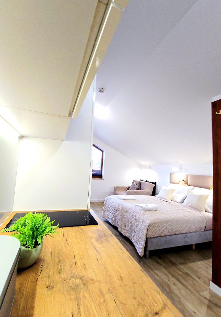 sypialnia z wygodnymi łóżkami pojedynczymi zestawionymi, szafkami nocnymi i przestronną szafą oraz pojedyncza rozkładana sofka. Wystrój utrzymany w ciepłych, relaksujących kolorach.