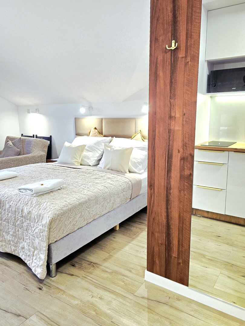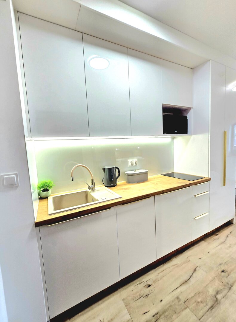 Aneks kuchenny: W pełni wyposażony w sprzęty AGD oraz sprzęt do przygotowania posiłków, kafeterka właska, ekspres przelewowy. Szafki i blat oferują dużo miejsca na przechowywanie i przygotowywanie posiłków.