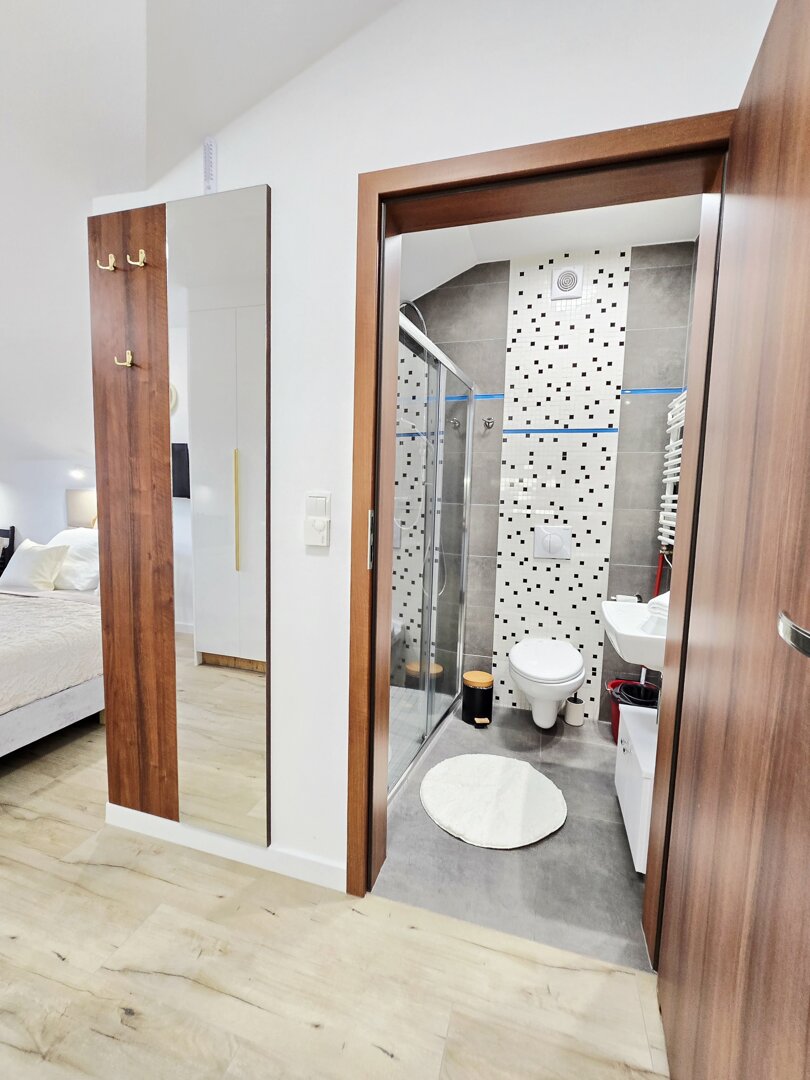 Łazienka: Nowoczesna łazienka z dużym prysznicem, umywalką, lustrem i toaletą.