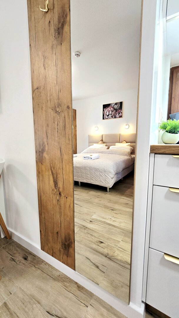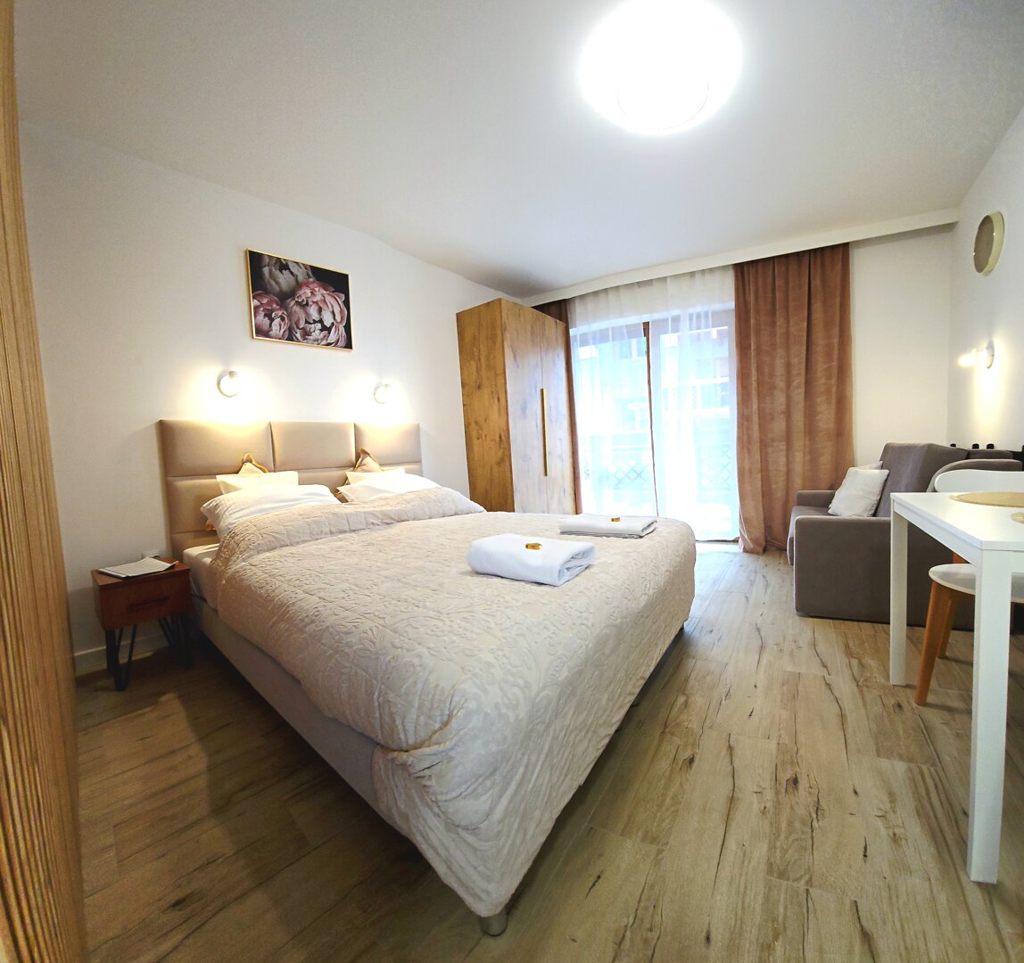 sypialnia z wygodnymi łóżkami pojedynczymi zestawionymi, szafkami nocnymi i przestronną szafą oraz rozkładana sofka mogąca pomieścić 1 osobę dorosłą lub 2 małych dzieci do 12 lat. Wystrój utrzymany w ciepłych, relaksujących kolorach.