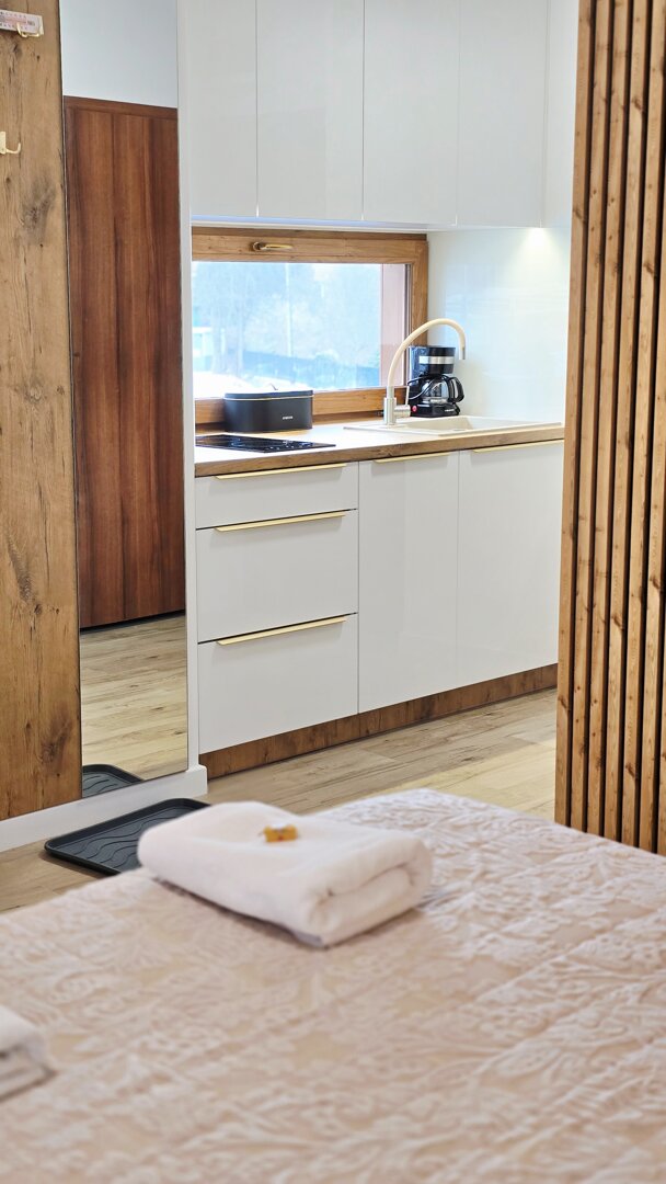Aneks kuchenny: W pełni wyposażony w sprzęty AGD oraz sprzęt do przygotowania posiłków, kafeterka włoska, ekspres przelewowy, zmywarka. Szafki i blat oferują dużo miejsca na przechowywanie i przygotowywanie posiłków.