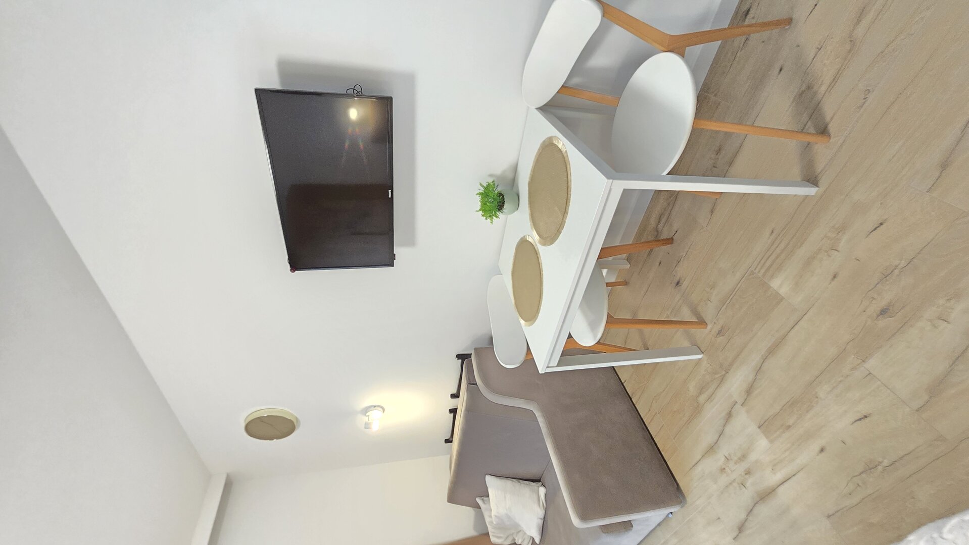 Pokój: W centrum znajduje się stół oraz krzesła, telewizor, sprzęt do prasowania, odkurzacz.